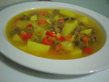今月の料理は、先月のシェリー酒入りコンソメスープで使った牛肉を再利用した一品を紹介します。今回使用した野菜でなくても、冷蔵庫にある残り野菜で結構です。サフランと良質のオリーブオイルの味と香りが豊かな絶品スープは、おかわりしてしまうこと間違いなしです。